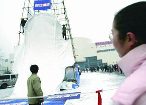 1月19日一早,記者經過國際展覽中心時發現工作人員正在支起一個三層樓高的巨型衛生巾展品。記者看到,白色的巨型衛生巾大概10米高,鋪平固定在酷似火箭發射架的腳手架上,用料和質地都和普通衛生巾一樣。展品周圍沒有任何相關說明和生產廠家的標志,只是在邊上立了一個寫有“自動清潔功能”的充氣人。六七個小時后,不知什么原因,這個巨型的衛生巾從國展前廣場又“神秘”消失了。