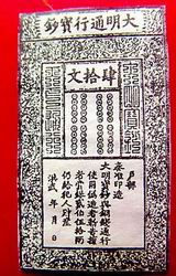 明清時期也曾發行過紙幣。明代的紙幣稱“大明通行寶鈔”(見圖),從洪武八年(1375年)起發行,行用了二百多年。它用桑皮紙印刷,其中一貫鈔長約一尺,寬約六寸,是中國歷史上面積最大的紙幣。