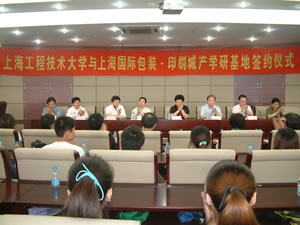 2004年6月22日下午,上海工程技術(shù)大學(xué)藝術(shù)設(shè)計(jì)學(xué)院和上海國際包裝·印刷城(SIPPC )在包裝城內(nèi)就共同建立“產(chǎn)學(xué)研基地”舉行了隆重的簽約儀式。上海市教委科技處處長王興放、上海市普陀區(qū)區(qū)委副書記葉維華、副區(qū)長包建強(qiáng)、上海市包協(xié)秘書長莊英杰、上海國際包裝·印刷城董事長錢成錫、上海工程技術(shù)大學(xué)校長汪泓、副校長孫培雷、藝術(shù)設(shè)計(jì)學(xué)院院長馬新宇和各科室?guī)熒跋嚓P(guān)人士近100人出席了簽約儀式現(xiàn)場。
