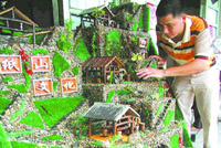 今年4月我市“兩會”期間,甌海人大代表提出要將澤雅造紙文化“申遺”消息傳來,令金建海興奮不已。他有了制作四連碓造紙作坊縮影的新設想。金建海一次次跑到四連碓原址,把造紙坊、池、水碓等一一測量好,并與木工、雕花師傅等商議好構圖,然后整整花了一個月把它制作出來。