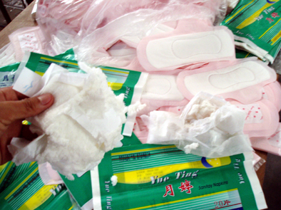 工商執(zhí)法人員在檢查中,撕開一些已經(jīng)包裝好的“高級衛(wèi)生巾”一看,里面全是碾碎的干紙漿,令人觸目驚心。工商執(zhí)法人員說,該加工點(diǎn)生產(chǎn)加工的“月婷”、“白牡丹”等女用“高級衛(wèi)巾”均是冒用他人的廠名、廠址和衛(wèi)生許可證號,又沒有衛(wèi)生許可證。現(xiàn)場看到的衛(wèi)生巾在包裝前沒有經(jīng)過衛(wèi)生消毒(現(xiàn)場沒有消毒設(shè)備),無疑會給使用者的健康帶來危害。