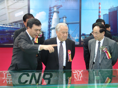 原全國政協(xié)副主席、中國企業(yè)聯(lián)合會會長陳錦華同志(中)參觀金海漿紙業(yè)投產(chǎn)慶典展覽