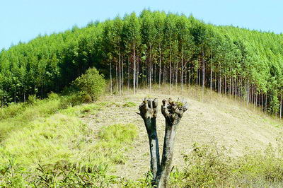 景谷縣鐘山鄉南景村弄令社馬家井桉樹無性系基地旁,齊刷刷的桉樹林與剛剛燒過的荒地形成鮮明的對比。