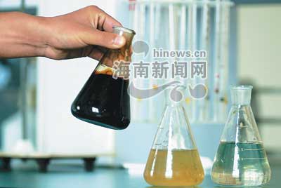 在金海漿廠實(shí)驗(yàn)室里,工作人員拿著制漿產(chǎn)生的“黑液”,以及處理一半的污水(中)和已經(jīng)處理完的污水(右)相對(duì)比