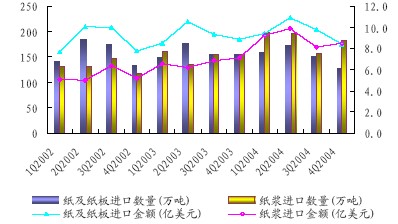 2004年我國進口紙及紙板、紙漿、廢紙、紙制品合計2592 萬噸,較2003 年2199萬噸增長17.87%,用匯96.87億美元,較2003年82.33億美元增加17.66%。紙及紙板進口量614萬噸,出口量125萬噸;紙制品進口量16萬噸,出口量96萬噸,紙及紙板和紙制品基本與2003年持平。