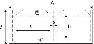 如圖1所示,長、寬、高分別為a、b、h的長方形手提紙袋,其成品尺寸a、b、h與成品展開尺寸A、B之間存在如下換算關系:展開后的長度A=2×(a+b)+側面粘口,展開后的寬度B=折口+h+底,其中側面粘口一般為2cm,折口一般為5cm。當開紙尺寸緊張時,側面粘口和折口可以稍微窄一點,如果手提紙袋很大則要稍微寬一些。手提紙袋的底=0.5×b+底部粘口,底部粘口一般為1cm左右,如果手提紙袋較大也可以寬一些。