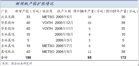 ●國內新聞紙消費近10年來保持了12%左右的增長,雖然我們依然看好國內新聞紙的中長期前景,但是我們認為隨著宏觀調控對房地產業的影響將逐漸顯現,占平面廣告業務量最大的房地產廣告將有所減少,新聞紙耗用量增長將放緩。預計06年、07新聞紙需求增長率約為10-11%。