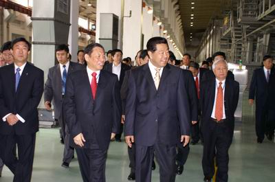 中共中央政治局常委、全國政協(xié)主席賈慶林(右)等一行在新加坡金鷹國際集團(tuán)董事局主席陳江和陪同下在車間視察生產(chǎn)情況。