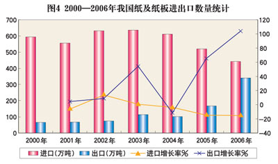 圖4 2000-2006年我國紙及紙板進(jìn)出口數(shù)量統(tǒng)計