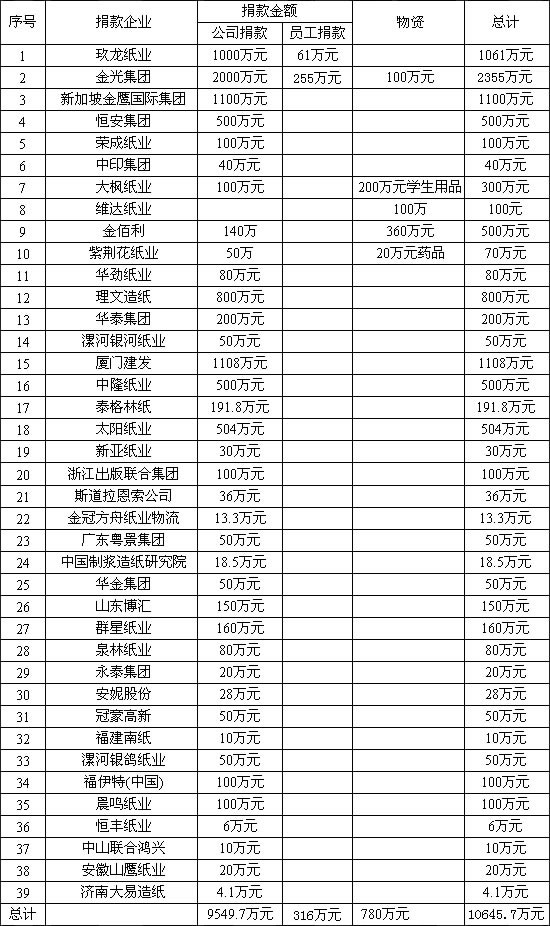 汶川地震發生后,引起了全社會的廣泛關注,造紙行業積極行動起來投入抗震救災的工作中,眾多造紙企業及時反應,迅速向災區伸出援助之手,紛紛向災區捐款捐物。據不完全統計,截至5月22日12時,造紙行業已有40余家企業自發向災區捐贈款物10390.7萬元,其中捐款9610.7萬元,各類物品780萬元。玖龍率先捐款1000萬元,張茵女士用此善舉有力了驗證了她“真金不怕火煉”的誓言。金光集團捐款2000萬元和價值100萬元的物資,黃志源先生說:“血濃于水,骨肉情深。華人華僑永遠關心祖國人民。相信在胡錦濤主席和溫家寶總理等中央領導的親自關懷下,在中央和地方政府的有力領導下,全球華人萬眾一心,災區人民一定能夠渡過難關”。金鷹集團已向災區捐款1100萬元,陳江河先生在抗震救災函中寫到:“汶川重災,天下失色。炎黃子孫,眾志成城。領袖關切,人民踴躍。家園雖頹,親情彌顯。五千年華夏民族之精魂,代代相傳!”。目前,仍有許多企業正在陸續參與到抗震救災當中。