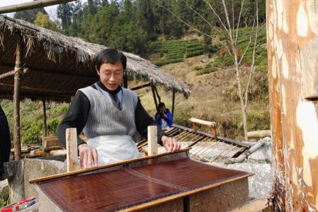 “現(xiàn)在只有7戶咯!以前,新元一個(gè)寨子30多家,家家都靠這生活。”村民周繼才看著手中的澆紙工具對記者說,“據(jù)我家公(祖父)回憶,他的前兩輩就已經(jīng)會(huì)造紙了,這樣一算,新元做皮紙至少有5代人以上的歷史。”