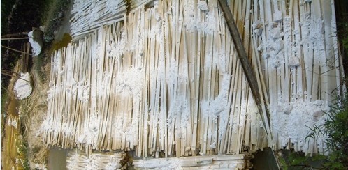 隆回縣灘頭鎮桃林村李志軍手工土紙作坊的員工們,充分利用該鎮豐富的楠竹資源,小滿節前后,忙于對手工土法造紙用的原材料----嫩竹,進行“倒山”,然后將其拖回家門口剖料、扎料下凼,并用生石灰與山泉水浸白料......在以后的幾個月時間內,完成一系列繁雜的工序后,原嫩竹即成熟料,用腳踩爛后,即可直接用于手工土法抄紙,造出一張張黃亮細膩、紋絡如織的土紙來。