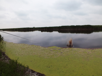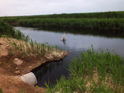 蘆葦蕩中一條條交織錯綜的黑色水渠如一條條黑色巨龍,在無邊的蘆葦蕩中瘋狂肆虐……好一幅“天蒼蒼,‘蘆’茫茫,風吹‘葦’低,見‘黑龍’”的景象!當地農民說:“這一片都屬于保護區范圍,蘆葦蕩下面原來都是自然生態清水,能夠養魚,過飛的鳥兒都喜歡停留;現在幾萬畝蘆蕩下面排的全是黑色污水,魚和其它水生動物幾乎沒了,能抗過污染存生的魚也不能吃;過飛的鳥兒幾乎不再停留。為污染保護區的事,已經有多家媒體來曝光過,但都沒用!”