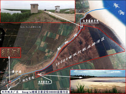 所謂“36000畝生態蘆葦區”其實就是射陽“雙燈紙業”的污水直排“灌溉”區;整個黑污蘆蕩區以海堤為底座向著黃沙港鎮“雙燈”呈倒三角地形,位于鹽城國家級珍禽保護區范圍內;“生態區”管道“密布”、水網縱橫,可因面積之大,蘆葦抗堿性而勝任每日千萬噸黑水暗藏,水位高時可通過西北角射陽河邊的水閘排污水至黃海(此圖根據谷歌衛星地圖繪制)