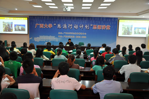 2012年4月11日下午,金光集團(tuán)黃奕聰慈善基金會(huì)校園公益宣講在廣西大學(xué)開講,黃奕聰慈善基金會(huì)秘書長(zhǎng)蘇薔華女士在廣西大學(xué)“思源講堂”為大學(xué)生做了“你今天大學(xué)生了沒”的公益主題宣講,此次宣講,是黃奕聰慈善基金會(huì)高校獎(jiǎng)學(xué)金暨校園宣講公益項(xiàng)目2011學(xué)年“走進(jìn)校園”的一部分。