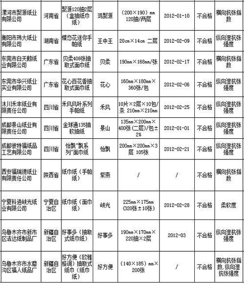 9日,記者從國家質檢總局網站了解到:烏魯木齊新市區潔達紙制品廠生產的好事多牌紙巾和烏魯木齊水磨溝區福人紙品廠生產的好方便牌紙巾質量抽檢不合格。