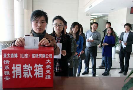4月26日,亞太森博(山東)漿紙有限公司組織員工為四川雅安地震災區進行捐款,員工踴躍參加。這是繼新加坡金鷹集團主席陳江和及旗下亞太森博(山東)在雅安地震第一時間捐款2000萬元之后,該公司員工的又一次愛心奉獻。