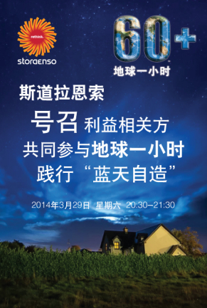 在世界第八個“地球一小時”活動來臨之際,斯道拉恩索中國區(qū)邀請全體員工、客戶、供應(yīng)商、社區(qū)群眾等利益相關(guān)方關(guān)注并加入“地球一小時”活動中,于2014年3月29日晚20:30—21:30熄燈一小時,為環(huán)境保護、節(jié)能減排貢獻自己的力量。“地球一小時”是世界自然基金會(WWF)應(yīng)對全球氣候變化所提出的一項倡議,希望個人、社區(qū)、企業(yè)和政府在每年三月最后一個星期六的晚上熄燈一小時,以表明應(yīng)對氣候變化行動的支持。