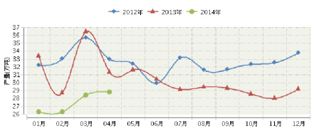 國家統計局統計數據顯示,2014年1月~4月,全國新聞紙行業累計完成產量109.98萬噸,同比增長-14.86%。其中:1月份完成產量26.31萬噸,同比增長-14.59%;2月份完成產量26.31萬噸,同比增長-14.59%;3月份完成產量28.43萬噸,同比增長-21.47%;4月份完成產量28.83萬噸,同比增長-6.85%。
