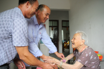 在鹿耳環社區,公司還特意為百歲老人鄭起容送上了慰問金,1908年出生的鄭阿婆今年已經106歲高齡,身體和精神狀況良好,在去年公司組織的進村采茶戲表演現場還有鄭阿婆的身影。在今年公司組織的雷鋒月進社區便民服務活動中,工作人員還上門為鄭阿婆剪過頭發,當工作人員送上慰問金時,通過村干部和家人的介紹,鄭阿婆很快就想起來了,臉上露出了笑容。(李興軍)