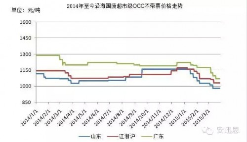 2014及2015年春節(jié)過(guò)后國(guó)廢OCC因貨量充裕原因價(jià)格傳統(tǒng)下行,然2015年跌勢(shì)拐點(diǎn)較2014年提前近一個(gè)月左右且降幅增大。