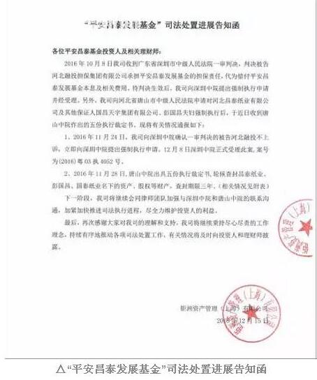 12月20日,鉅派又發放《“平安昌泰發展基金”司法處置進展告知函》,告知所有投資人:河北融投擔保集團有限公司被判承擔擔保責任,代為償付平安昌泰發展基金本息及相關費用。