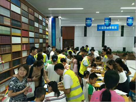 活動當日恰逢天降甘露,但絲毫擋不住讀者們的熱情,很多讀者提前1個多小時就來排隊,很快日照江和圖書館的大廳里就人頭攢動,聚集了上千人。亞太森博的志愿者們也早早趕到現場忙碌起來,有的布置現場,有的維持秩序,有的搬運書籍,有的向到場的市民朋友介紹活動內容,整個現場熱鬧而溫馨。