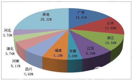 數據來源:中商產業研究院 包裝行業競爭格局分析 我國包裝行業經過30多年的發展,目前已經形成了以長三角、珠三角、環渤海灣三個地區為重點區域的包裝產業格局。從產值分布上看,根據中國包裝聯合會的統計,上述三大地區包裝工業產值之和約占全國包裝工業總產值的60%以上。2015年我國包裝行業累計主營業務收入地區占比統計數據顯示,廣東、山東、浙江、江蘇等重點區域的包裝行業主營業務收入仍處于全國領先地位。隨著西部地區的大開發、東北工業基地振興以及沿海產業向中西部梯度轉移步伐加快等戰略實施,內地省份的包裝產業在近幾年有了一定的發展,但整體產業規模和技術水平與沿海地區相比仍存在較大差距。 中國包裝行業累計主營業務收入地區占比情況