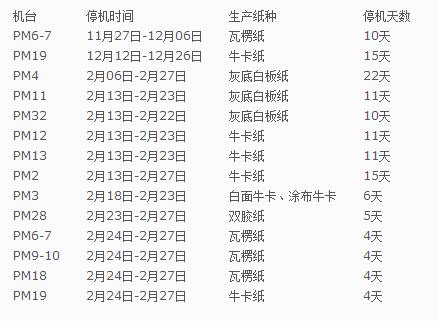 除此之外,東莞玖龍、太倉玖龍也公布了停機計劃。其中,東莞玖龍從11月27日到春節期間,各機臺輪流停機檢修,涉及瓦楞紙、牛卡紙、灰底白板紙、雙膠紙等多個紙種,停機時長在4-22天不等,累計總時長達130多天。 而太倉玖龍停機時長相對較短。據停機函上顯示: PM8號機在2月26日-3月2日期間,停機5天,停機紙種為牛卡紙; PM16號機在2月5日-2月9日期間,停機5天,停機紙種為瓦楞紙; PM17號機在3月5日-3月9日期間,停機5天,停機紙種為瓦楞紙。 隨著“冬季霧霾戰”的打響,多省市紙廠面臨停產、限產。而現在南方紙廠漲價,山鷹、玖龍以及浙江多地紙廠停機,無疑是在為當前供應過剩的造紙行業安下一顆定心丸,很有可能會為紙價保底甚至觸底反彈提供一個很好的契機。 但具體什么時候迎來全面反彈,還不明確,唯一可確定的是,距離反彈的時間越來越近了。