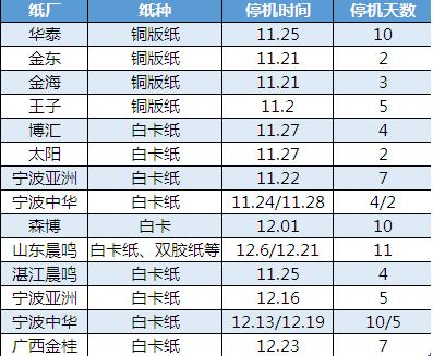 年底,迎來(lái)了白卡紙、雙膠紙和銅版紙主流廠商停機(jī)檢修期,預(yù)計(jì)減少市場(chǎng)供給25萬(wàn)噸左右。