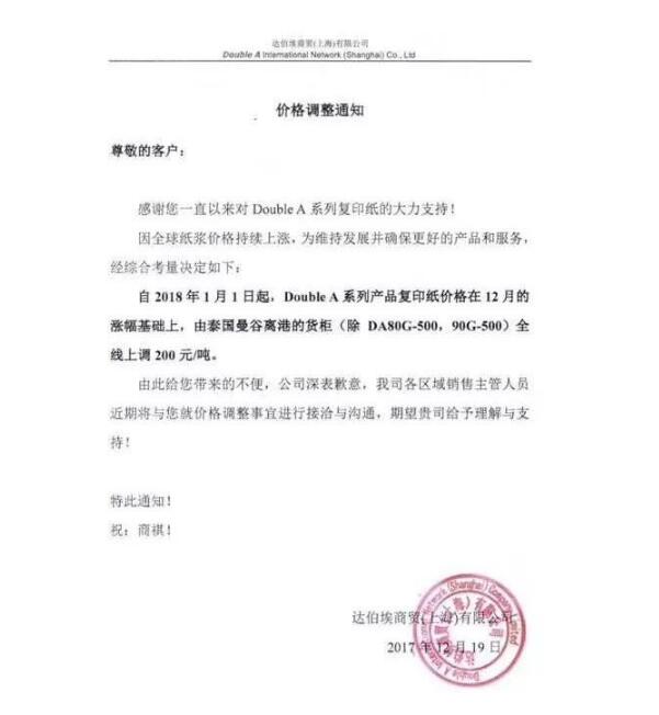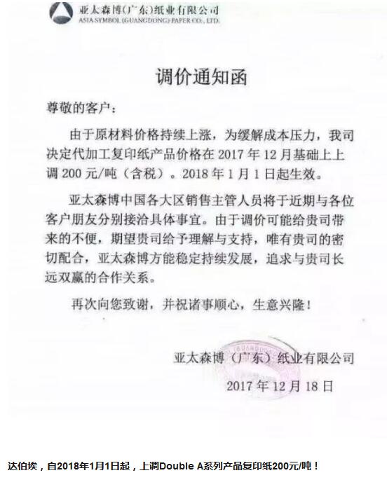 亞太森博,自2018年1月1日起,上調(diào)加工復(fù)印紙產(chǎn)品200元/噸!