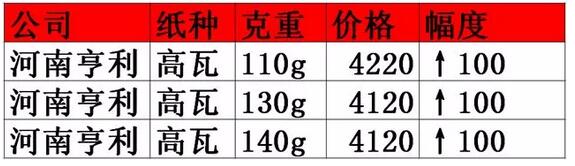 說明:表格中價格指到廠價或自提價,僅供參考。 河南亨利紙業(yè)、新亞紙業(yè):瓦楞紙價格上調(diào)50-100元/噸 而河南的中小紙廠沉寂了一小段時間后,當前又開始小幅提價。據(jù)華印小編調(diào)查得知,自4月16日起,河南亨利紙業(yè)部分高強瓦楞紙價格上漲100元/噸。目前公司110-140g高瓦價格在4120-4220元/噸左右。河南新鄉(xiāng)新亞紙業(yè)集團80g瓦楞原紙?zhí)醿r50元/噸,目前在醞釀繼續(xù)提價。