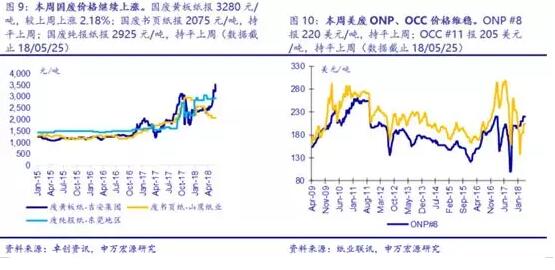 2018年5月28日,申萬(wàn)宏源發(fā)布了包裝紙周報(bào)。數(shù)據(jù)顯示,受美廢政策松動(dòng)影響,上周(5月21日-26日)廢紙價(jià)格由漲轉(zhuǎn)跌,目前跌勢(shì)仍在延續(xù),但供給緊張格局不變。玖龍、理文等大廠方面,瓦楞箱板紙價(jià)格開始趨穩(wěn)。箱板紙終端均價(jià)為5944元/噸,瓦楞紙終端均價(jià)為5358元/噸,均持平前一周,目前瓦楞箱板紙庫(kù)存維持在低位水平。 廢紙價(jià)格“跌跌不休”,但供給緊張格局不變 黃板紙:上周黃板紙低端價(jià)格快速補(bǔ)漲,主要集中在江浙地區(qū)紙廠,最高累計(jì)補(bǔ)漲達(dá)330元/噸,而因補(bǔ)漲較迅速,紙廠到貨量集中,周三開始浙江地區(qū)率先開始下調(diào)100-200元/噸,部分紙廠更是一日兩跌,目前跌勢(shì)仍在繼續(xù)。但由于前期出現(xiàn)暴漲,截至5月25日廢紙價(jià)格依舊維持相對(duì)高位。