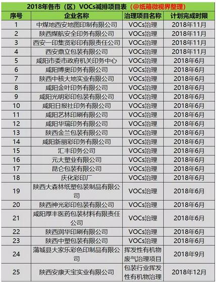 6月15日,陜西省環保局表示,為促進全省生態環境質量進一步改善,根據陜西省委、省政府關于2018年總量減排及治污降霾、水污染防治工作的總體部署和要求,制定《陜西省2018年度主要污染物總量減排實施方案》。 2家紙企、25家印刷包裝企業需限期完成任務 (一)不斷加強結構減排力度。加強對淘汰關停企業的排查督辦力度,嚴格杜絕不符合產業政策、超標排放或對環境污染嚴重的已關閉的重污染企業死灰復燃。制定關中地區高耗能、高排放行業企業退出工作方案,率先關停搬遷關中核心區企業,重點壓減水泥(不含粉磨站)、焦化、石油化工、煤化工、防水材料、陶瓷(不含以天然氣為燃料)、保溫材料等行業企業產能。完成關中地區35蒸噸/時以下燃煤鍋爐、燃煤設施和工業煤氣發生爐、熱風爐、導熱油爐60%的拆除或改造任務。