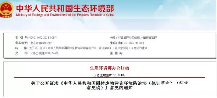 新的固廢污染環境防治法(修訂草案)已起草 為深入推進我國固體廢物污染環境防治工作,有效防范固體廢物污染環境風險,根據全國人大立法工作計劃,在認真調查研究的基礎上,我部研究起草了《中華人民共和國固體廢物污染環境防治法(修訂草案)(征求意見稿)》。 為充分了解各方面意見,進一步做好修訂工作,現就《固體廢物污染環境防治法(修訂草案)(征求意見稿)》(附件1)公開征集意見。 各機關團體、企事業單位和個人均可參照意見建議格式(見附件3),向我部提出意見和建議,征集意見截止時間為2018年8月18日。 聯系人:生態環境部熊晶姜棟棟 電話:(010)66556293 傳真:(010)66556252 郵箱:swmd@mep.gov.cn 通信地址:北京市西城區西直門南小街115號 郵政編碼:100035 附件:1.中華人民共和國固體廢物污染環境防治法(修訂草案)(征求意見稿) 2.《中華人民共和國固體廢物污染環境防治法(修訂草案)(征求意見稿)》修訂說明 3.反饋意見建議格式 生態環境部辦公廳 2018年7月11日 主要修改內容有哪些? 1、增設生活垃圾分類制度,要求地方政府做好分類投放、分類收集、分類運輸、分類處理體系建設,為推動實施《生活垃圾分類制度實施方案》提供法律支撐; 2、國家實行工業固體廢物排污許可制度,產生工業固體廢物的單位須申請領取排污許可證,并按照排污許可證要求管理所產生的工業固體廢物; 3、按照產生者付費原則,縣級以上地方人民政府可以根據本地實際建立差別化的生活垃圾排放收費制度; 4、收集、貯存、運輸、利用、處置危險廢物的單位,應按照國家有關規定,參加環境污染強制責任保險。 中華人民共和國固體廢物污染環境防治法(修訂草案)(征求意見稿) 第一章:總則 第二章:固體廢物污染環境防治的監督管理 第三章:固體廢物污染環境的防治 第一節:一般規定 第二節:工業固體廢物污染環境的防治 第三節:生活垃圾污染環境的防治 第四章:危險廢物污染環境防治的特別規定 第五章:法律責任 第六章:附則 第一章總則 第一條:為了防治固體廢物污染環境,保障人體健康,維護生態安全,促進經濟社會可持續發展,制定本法。 第二條:本法適用于中華人民共和國境內固體廢物污染環境的防治。固體廢物污染海洋環境的防治和放射性固體廢物污染環境的防治不適用本法。 第三條:國家對固體廢物污染環境的防治,實行減少固體廢物的產生量和危害性、充分合理利用固體廢物和無害化處置固體廢物的原則,促進清潔生產和循環經濟發展。利用固體廢物不得污染環境、損害人體健康。國家采取有利于固體廢物綜合利用活動的經濟、技術政策和措施,對固體廢物實行充分回收和合理利用。國家鼓勵、支持采取有利于保護環境的集中處置固體廢物的措施,促進固體廢物污染環境防治產業發展。 第四條:縣級以上人民政府應當將固體廢物污染環境防治工作納入國民經濟和社會發展計劃,并采取有利于固體廢物污染環境防治的經濟、技術政策和措施。國務院有關部門、縣級以上地方人民政府及其有關部門組織編制城鄉建設、土地利用、區域開發、產業發展等規劃,應當統籌考慮減少固體廢物的產生量和危害性、促進固體廢物的綜合利用,最大限度降低固體廢物填埋處置量。 第五條:國家對固體廢物污染環境防治實行污染者依法負責的原則。固體廢物的產生者對其產生的固體廢物依法承擔固體廢物污染環境防治責任。 第六條:公民應當增強環境保護意識,積極參與固體廢物污染環境防治,踐行簡約適度、綠色低碳的生活方式,減少固體廢物產生。 第七條:國家鼓勵、支持固體廢物污染環境防治的科學研究、技術開發、推廣先進的防治技術和普及固體廢物污染環境防治的科學知識,制定固體廢物科技專項規劃,加強固體廢物污染環境防治科技支撐。各級人民政府應當加強防治固體廢物污染環境的宣傳教育,將固體廢物污染環境防治知識課程納入中小學教育體系,倡導有利于環境保護的生產方式和生活方式。 第八條:國家鼓勵單位和個人購買、使用再生產品和可重復利用產品。 第九條:各級人民政府對在固體廢物污染環境防治工作以及相關的綜合利用活動中作出顯著成績的單位和個人給予獎勵。 第十條:任何單位和個人都有防治固體廢物污染環境的義務。對造成固體廢物污染環境的行為,公民、法人和其他組織有權向縣級以上人民政府有關部門舉報。 第十一條:國務院生態環境主管部門對全國固體廢物污染環境的防治工作實施統一監督管理。國務院經濟綜合宏觀調控、工業信息化、住房城鄉建設、交通運輸、農業農村、衛生健康等部門在各自的職責范圍內組織開展固體廢物污染環境防治工作。縣級以上生態環境主管部門對本行政區域內固體廢物污染環境的防治工作實施統一監督管理。縣級以上地方人民政府經濟綜合宏觀調控、工業信息化、住房城鄉建設、交通運輸、農業農村、衛生健康等部門在各自的職責范圍內組織開展固體廢物污染環境防治工作。 第二章:固體廢物污染環境防治的監督管理 第十二條:國務院生態環境主管部門會同國務院有關行政主管部門根據國家環境質量標準和國家經濟、技術條件,制定國家固體廢物鑒別標準和污染環境防治技術標準。 第十三條:設區的市級人民政府生態環境主管部門應當定期按要求發布固體廢物的種類、產生量、處置狀