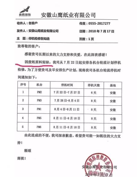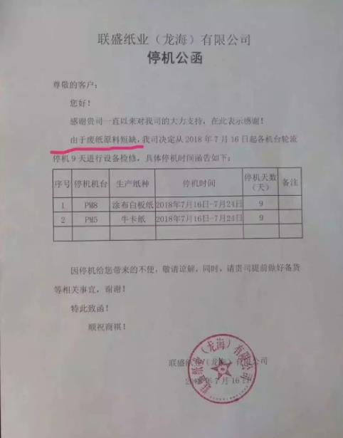 繼東莞玖龍、太倉玖龍、福建聯(lián)盛三大紙廠發(fā)布停機(jī)通知后,龍海聯(lián)盛、安徽山鷹、江蘇理文、東莞理文、廣東理文四家紙廠也加入了停機(jī)隊伍,涉及17臺紙機(jī),停機(jī)時長在4-13天不等。 短短兩天時間,國內(nèi)造紙行業(yè)便有7家大型紙廠發(fā)布停機(jī)檢修計劃,一共涉及35臺紙機(jī),涵蓋瓦楞紙、牛卡紙、灰底白板紙、涂布白板紙、文化紙等多個紙種。紙廠如此大面積的停機(jī),背后究竟是什么原因在作祟? 7月15-16日,東莞玖龍、太倉玖龍、福建聯(lián)盛三大紙廠宣稱因廢紙原料短缺,將進(jìn)行停機(jī)檢修,震驚業(yè)內(nèi)。詳見: 福建聯(lián)盛:7月16日起,對生產(chǎn)高強(qiáng)瓦楞原紙的PM33機(jī)臺停機(jī)檢修7天。 東莞玖龍:7月20日起,生產(chǎn)?ㄍ呃慵垺⒒业装装寮、文化紙的9臺機(jī)組停機(jī)檢修7-11天。 太倉玖龍:7月18日起,生產(chǎn)瓦楞紙、灰底白、文化紙、?埖8臺機(jī)組停機(jī)檢修7天。 不過一兩天時間,龍海聯(lián)盛、安徽山鷹、江蘇理文、東莞理文、廣東理文四家紙廠也加入了停機(jī)隊伍,涉及17臺紙機(jī),停機(jī)時長在4-13天: 龍海聯(lián)盛:7月16日起,生產(chǎn)涂布白板紙和牛卡紙的兩臺紙機(jī)停機(jī)檢修9天。