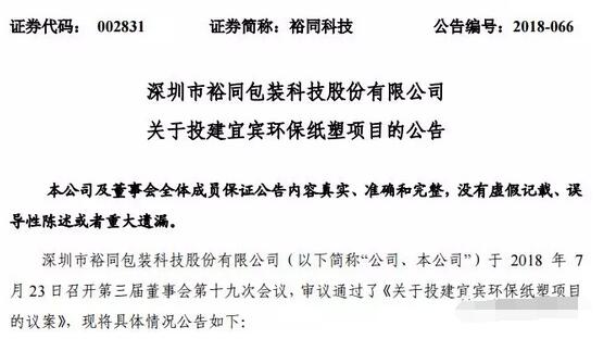 7月24日,深圳市裕同包裝科技股份有限公司公告稱,擬在四川省宜賓市臨港經濟技術開發區投資不超過人民幣6億元新建宜賓環保紙塑項目,產品應用于餐飲、食品、消費類電子、酒等行業,主要產品為餐盒和紙托。