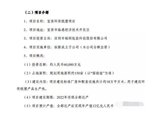 公告顯示,隨著全球環保意識不斷增強以及國家環保政策不斷收緊,環保紙塑產品潛在市場廣闊,行業處于成長期,且公司已擁有成熟的技術和產品。為進一步提升公司在環保紙塑產品方面的綜合配套服務能力,結合市場需求及公司自身發展規劃,擬設立此公司。 投資總額:約人民幣60,000萬元 占地面積:規劃用地面積約150畝(以“招拍掛”為準) 建設內容:項目建設標準廠房和配套設施共計約18萬平方米,用于建設環保紙塑產品生產線。 項目建設期限:2022年實現全部達產 項目預計產值:全部達產后實現年產值12億元人民幣