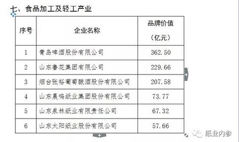 9月7日,由山東省質(zhì)監(jiān)局聯(lián)合省發(fā)展改革委、省經(jīng)濟(jì)和信息化委、省科技廳、省住房城鄉(xiāng)建設(shè)廳等八部門及濟(jì)南市人民政府共同舉辦全省“質(zhì)量月”活動啟動儀式在濟(jì)南舉行。會上發(fā)布2018年度山東省制造業(yè)百家高端品牌培育企業(yè)名單以及制造業(yè)高端品牌培育企業(yè)品牌價值50強(qiáng)。 在食品加工及輕工產(chǎn)業(yè)類中,山東晨鳴紙業(yè)集團(tuán)有限公司,山東泉林紙業(yè)有限責(zé)任公司和山東太陽紙業(yè)股份有限公司入選,三家的品牌價值分別為73.77億元、67.32億元和57.66億元。