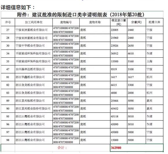 9月19日,中國固廢中心公布的2018年第20批限制進口許可證顯示,審核通過了浙江寧波亞洲漿紙業(yè)有限公司、浙江寧波中華紙業(yè)有限公司、浙江平湖榮成環(huán)保科技有限公司、浙江臺州森林造紙有限公司、浙江華鑫紙業(yè)有限公司、浙江金龍紙業(yè)有限公司、浙江景興板紙有限公司、浙江景興紙業(yè)股份有限公司,浙江山鷹紙業(yè)有限公司共獲核準總量為36.2980萬噸。