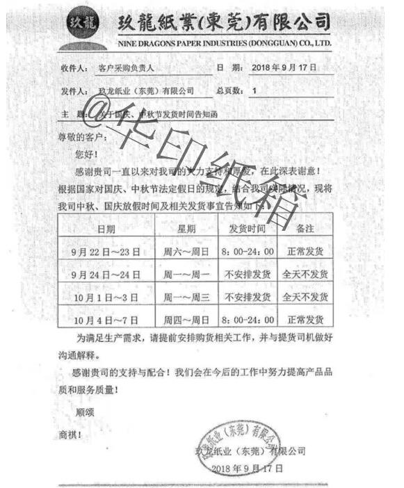 東莞玖龍亦發(fā)布了國慶期間包裝紙停止出貨的通知,假期前三天全天停止發(fā)貨。具體安排如下:10月1日-3日(周一至周三)不安排發(fā)貨(全天不發(fā)貨)。