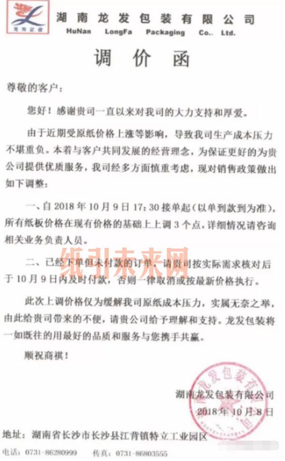 汕頭市萬豐紙品實業有限公司:從2018年10月5日中午12點起,兩層紙板價格每平方上調0.04元;三層紙板價格每平方上調0.06元;四層紙板價格每平方上調0.08元;五層紙板價格每平方上調0.10元;六層紙板價格每平方上調0.12元;七層紙板價格每平方上調0.14元。等通知生產的訂單一律不接。