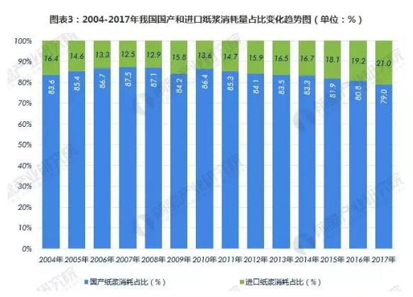 在我國,造紙中使用廢紙中進口廢紙所占的比重較高,進口廢紙數量的變化對于國內造紙市場的影響較大。造紙業協會統計數據顯示,2017年我國紙漿消耗中,國產紙漿消耗占比為79.0%,而廢紙漿消耗占比達到了21.0%,處于較高水平。