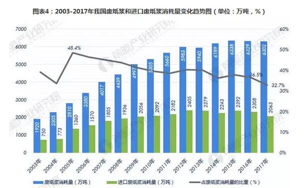 從進口廢紙漿占我國廢紙漿消耗量的比重來看,2017年我國廢紙漿消耗量為6302萬噸,其中2063萬噸來自進口廢紙制漿,依存度為32.7%。