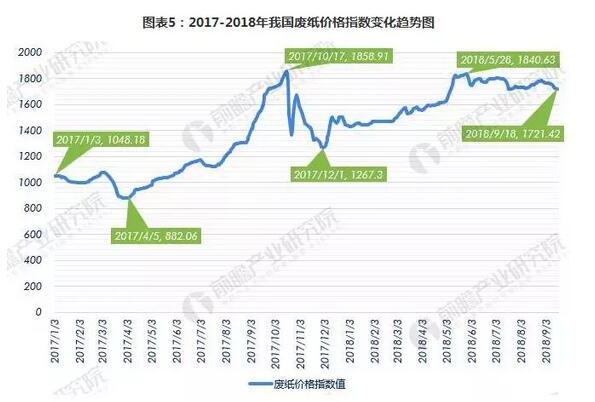 據中國再生資源回收利用協會廢紙分會統計,2017年1月以來我國廢紙價格整體上揚,尤其是在2017年10月份達到了歷史新高1858.91,雖有有所下滑,而2018年以來我國廢紙價格繼續保持上揚,5月28日,廢紙價格達到1840.63,處于較高水平。2018年9月18日我國廢紙價格指數為1721.42。受外廢進口數量和質量限制影響,廢紙市場供給不足將助推廢紙價格持續上揚。廢紙進口限制對于國內廢紙價格的影響仍將持續。