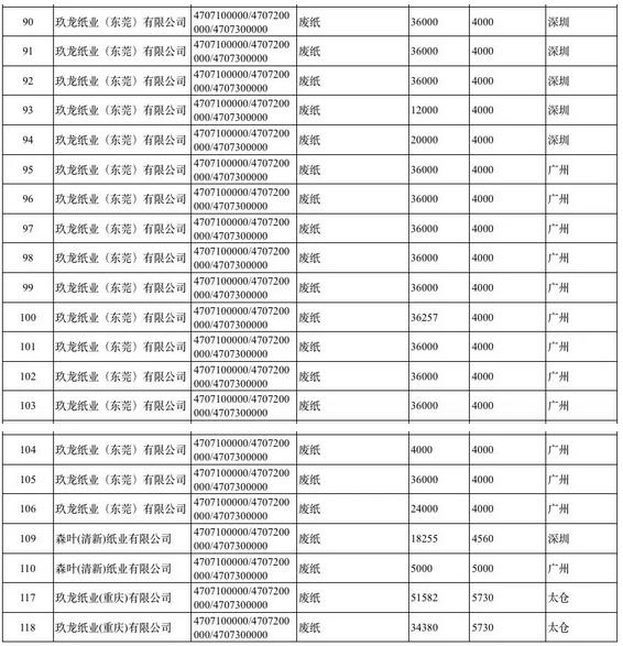 該表顯示,此批外廢進(jìn)口核定進(jìn)口總量為201.2821萬噸,批準(zhǔn)47家企業(yè),創(chuàng)2018年核定工廠數(shù)量最高記錄。其中玖龍紙業(yè)(東莞)有限公司此次拿到的批文數(shù)量最多達(dá)60.0257萬噸,占此次核發(fā)總量的29.82%。
