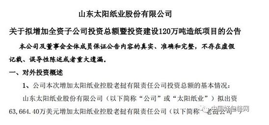 三、太陽紙業(yè)在老撾實(shí)施年產(chǎn)120萬噸造紙項(xiàng)目 2018年7月8日,太陽紙業(yè)公告稱,擬增加投資6.37億美元,用于在老撾建設(shè)120萬噸造紙項(xiàng)目。增加投資總額完成后,老撾公司的投資總額將由4.33億美元增加到約10.7億美元。 老撾公司是太陽紙業(yè)全資控股的境外子公司,成立于2010年8月11日,投資總額4.33億美元。太陽紙業(yè)在老撾的“林漿紙一體化”項(xiàng)目由其負(fù)責(zé)實(shí)施,“林漿紙一體化”項(xiàng)目已經(jīng)獲得老撾投資計(jì)劃部批準(zhǔn),實(shí)施地點(diǎn)在老撾沙灣拿吉省。 該項(xiàng)目主要以進(jìn)口美國廢紙和歐洲廢紙為原料,建設(shè)一條年產(chǎn)量40萬噸再生纖維漿板生產(chǎn)線和2條年產(chǎn)40萬噸高檔包裝紙生產(chǎn)線(項(xiàng)目年漿、紙產(chǎn)能將達(dá)到120萬噸),以及熱電廠、廢紙回收紙棚、供水廠改建、廢水預(yù)處理、道路、堆場等配套工程。