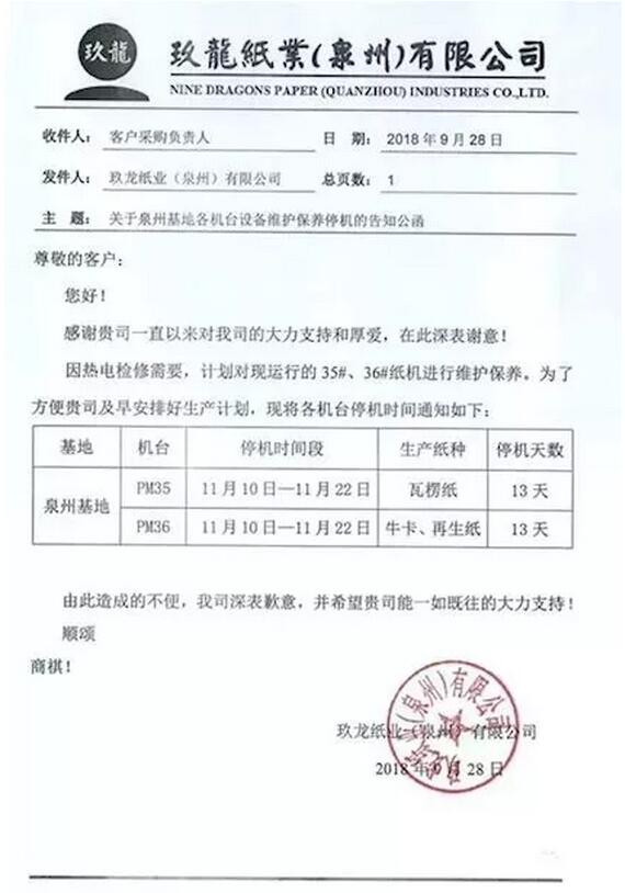 雙十一大戰(zhàn)即將打響! 數(shù)十億套個(gè)包裹,數(shù)十億的包裝 紙包裝業(yè)滿以為可以撒歡狂歡一把 然鵝! 狂歡?不存在的! 電商包裝的一枝獨(dú)秀無(wú)法掩蓋整體需求的低迷, 大半年積存的庫(kù)存壓力終究要釋放的。 于是乎, 一手“停機(jī)削供給”,一手“降價(jià)去庫(kù)存”的胡蘿卜加大棒政策出臺(tái)了 ▼▼▼ 吶! 💥中國(guó)包裝紙行業(yè)的龍頭老大及舵手💥 💥產(chǎn)能占據(jù)中國(guó)包裝紙產(chǎn)能四分之一強(qiáng)的紙業(yè)巨頭💥 ······· 玖龍紙業(yè)再一次宣布降價(jià)了! 絕對(duì)的風(fēng)向標(biāo)!!!