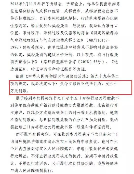 經復核,北京環保局認為采樣口位置、采樣程序、采樣過程及儀器等均符合《固定污染源排氣中顆粒物測定與氣態污染物采樣方法》(GB/T16157-1996)的相關規定,于10月18日發布京環保監察罰字〔2018〕53號行政處罰決定書,決定責令公司立即改正違法行為,處六十萬元罰款。