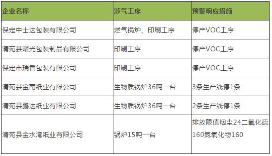 河北省環保局發布通知稱,預計11月12日~15日,擴散條件持續轉差,高空處于脊區,近地面受偏南氣流、小風和高濕影響,河北省中南部和東部地區可能出現中度至重度污染過程,現請各市及相關成員單位按照《河北省重污染天氣應急預案》要求,區域一、區域二城市于11月11日18時至16日12時發布重污染天氣橙色預警,啟動Ⅱ級應急響應。 目前,石家莊、保定等地已積極響應號召,實施緊急情況下的停限產措施。 保定市 經市政府研究決定,我市于11月11日12時啟動重污染天氣II級應急響應措施。請各縣(市、區)政府、市直有關部門按照預案落實各項應急措施,也請廣大市民加強防護。 本次預警解除時間為2018年11月16日12時。 以保定市清苑區為例,當地66家工業企業需要停限產,其中有6家包裝紙、紙箱企業在停限產名單之列。 保定市清苑區停限產企業名單(11月12日-11月15日)  廊坊市是河北省直轄的一個地級市,位于河北省中部偏東,地處北京、天津兩大直轄市之間,被譽為"京津走廊上的明珠"。轄廣陽、安次兩個區,大廠、香河、永清、固安、文安、大城六個縣和廊坊經濟技術開發區,代管三河、霸州兩個縣級市。廊坊市歷史悠久,早在6000多年前就有人類在此聚居。4000多年前"黃帝制天下以立萬國,始經"安墟","安墟"即在現安次區附近。廊坊素有"京津走廊、黃金地帶"之稱。市區距北京天安門廣場40公里,距天津中心區60公里,距首都和天津兩大機場70公里,距天津港100公里,且緊鄰規劃中的北京新機場。7條高速公路,5條鐵路干線穿越境內,10條國家和20條省級公路縱橫交錯,是中國鐵路、公路密度最大的地區之一。1900年廊坊發展經歷了3個重要階段。第一次是1898年京山鐵路(北京-山海關)在廊坊設站,成為近代廊坊發展的開端。隨著京山鐵軌的延伸,客商開始云集,人口與日俱增。短短幾年,廊坊從一個不知名的小村落,迅速發展成為一個小鎮,并隨著義和團"廊坊大捷"蜚聲國內。到1937年"七七事變"前夕,廊坊城區面積0.4平方公里,人口近4千,已建有"三角地"、東南西北四條主街及東小街、南小街。第二次是1951年,安次縣設廊坊鎮,原安次縣城被永定河洪水淹沒,縣治遷往廊坊鎮,廊坊成為縣級行政中心。1948年12月13日廊坊解放,當時城區面積僅0.5平方公里,人口僅5000人;共8條街道(4條主街與4條背街),全部為土路,且較狹窄,全長不足3000米。城區僅有房屋3000余間,建筑面積約3.6萬平方米。1949年初廊坊設鎮,隸屬安次縣。1950年安次縣政府遷駐廊坊。1958年全國農村以社代鄉,廊坊鎮遂并入廊坊公社。1965年又重新恢復廊坊鎮建制。1969年天津地區革命委員會遷址廊坊。第三次是1973年,天津地區行政公署由天津市遷往廊坊鎮(最初天津地區行政公署駐楊柳青鎮的石家大院,現為楊柳青博物館,后公署遷天津市),廊坊由此成為地級行政中心;1981年廊坊鎮升為縣級廊坊市,從此廊坊真正成為城市;1989年4月經國務院批準廊坊地區改為省轄地級市,原廊坊市改為安次區。 石家莊 按照省要求,石家莊市將于2018年11月11日12時啟動重污染天氣Ⅱ級應急響應,11月16日12時自動解除。 衡水 定于11月11日12時至11月16日12時,啟動重污染天氣Ⅱ級(橙色)應急響應。 工業企業按照“一廠一策”采取停產、限產、輪流停產、降低生產負荷和加強污染治理等措施實現應急減排目標。 邢臺 邢臺市大氣污染防治工作領導小組經研究決定,自2018年11月11日0時至16日12時啟動重污染天氣橙色預警,按照《邢臺市重污染天氣應急預案》(邢政辦字〔2018〕81號)實施Ⅱ級應急響應措施: 所有企業露天堆放的散裝物料全部苫蓋。 鋼鐵、焦化、電力、玻璃、化工等涉及大宗原材料及產品運輸的重點用車企業,制定錯峰運輸“一廠一策”實施方案,停止原材料機動車運輸,產品機動車運輸限制在50%以內。 玻璃、焦化、鋼鐵等企業按照邢臺市大氣污染防治領導小組《關于主城區進一步嚴控SO2、NO2、CO排放的強化措施》(邢氣領〔2018〕4號)文件執行。 除錯峰生產企業外,非金屬礦物制品行業內所有企業全部停產。 部分重點企業采取臨時性減排措施。 滄州 于11月11日12時至16日12時發布重污染天氣橙色預警,啟動二級應急響應(如需延長響應,另行通知)。 1.采暖季錯峰生產企業在嚴格執行錯峰生產的基礎上進行停限產,原材料及產品錯峰運輸參照減排比例執行。 2.預警停產企業嚴格執行停產措施。 3.輪流停產企業嚴格執行輪流停產措施。 4.減限產企業嚴格執行減限產措施。 5.涉及大宗物料運輸的重點用車企業以及黃驊港、城市物流配送企業,結合企業實際情況,減少運輸車流量,原則上不允許柴油貨車進出廠區。 6.停止室外噴涂、粉刷、切割、護坡噴漿作業。